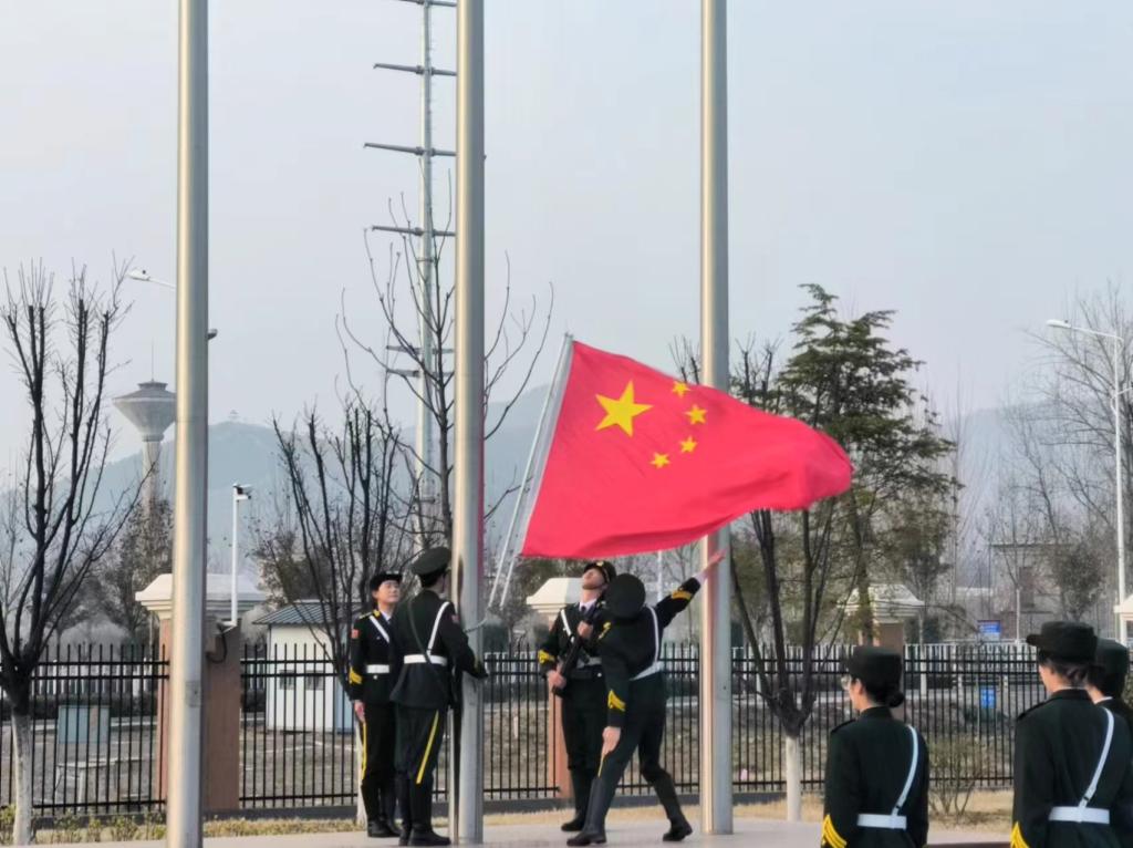 伴随着雄壮激昂的国歌旋律,五星红旗在蓝天白云的映衬下冉冉升起。同学们整齐地站立着,目光紧随旗帜,神情庄重而充满敬意。