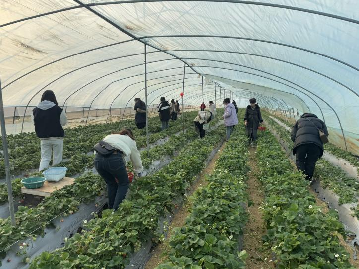 下午三时,阳光和煦,春意盎然。女教职工们抵达乐土农场,在工作人员的引导下走进草莓大棚。翠绿的藤叶间缀满鲜红饱满的果实,清新的果香扑面而来。大家手持采摘篮,弯腰俯身,一边挑选成熟的草莓,一边分享生活趣事,现场气氛轻松融洽,欢声笑语不断。农场负责人介绍,园内草莓采用生态种植技术,绿色健康,女教职工们不仅体验了采摘的乐趣,更感受到乡村振兴背景下的现代农业魅力。